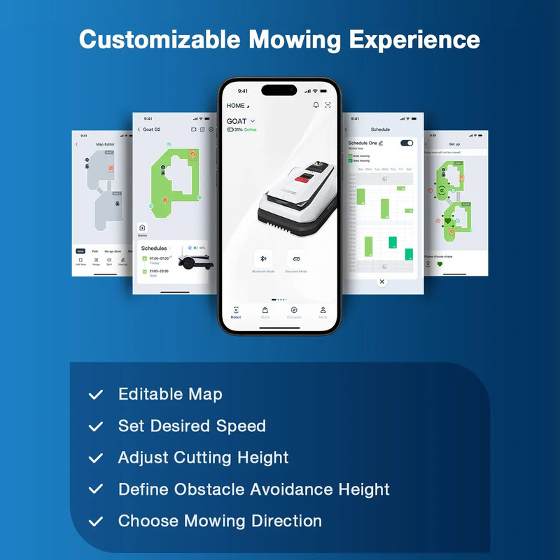 Via de mobiele app kun je eenvoudig zones beheren, maaischema’s instellen en de robot in realtime volgen.
